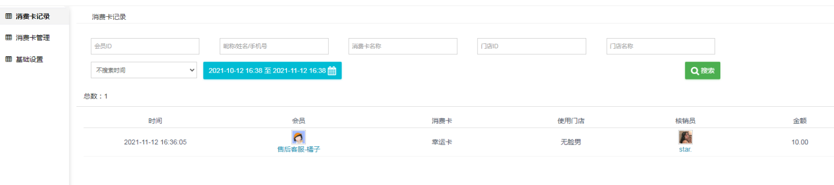 消费卡记录:消费卡购买记录及条件筛选。